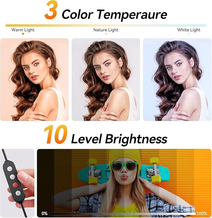 【Dimmable Light & Arched Lampshade】: 12" Ring Light provides 3-color lighting modes, Warm Light, Cool White, Day Light, and 10-level brightness from 10% -100%, it is the perfect extra light to take away all the unflattering shadows. The arched lampshade design makes the light more even and balanced, reduces the stimulation of the light and protects the eyes.