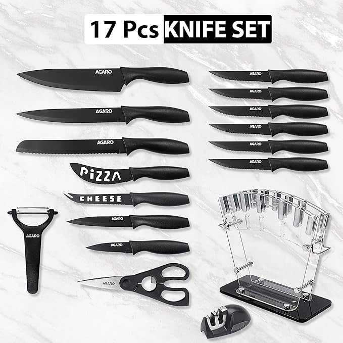 All-in-one complete set of specialized kitchen knives consist of 13 professional knives, kitchen scissors, peeler, a premium quality 2 stage knife sharpeners and a modern acrylic knife stand
