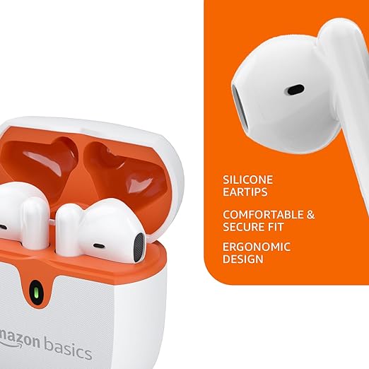 amazon basics True Wireless in-Ear Earbuds with Mic, Touch Control, IPX5 Water-Resistance, Bluetooth 5.3, Up to 36 Hours Play Time, Voice Assistance and Fast Charging (White)