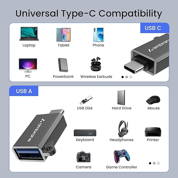 Ambrane USB Type C Male to USB Female OTG Adapter, Compatible with MacBook Pro/Air, Galaxy S20 S20+ Ultra Note 10 S9 S8 and All Type-C Devices,Portable and High-Speed Data Transfer