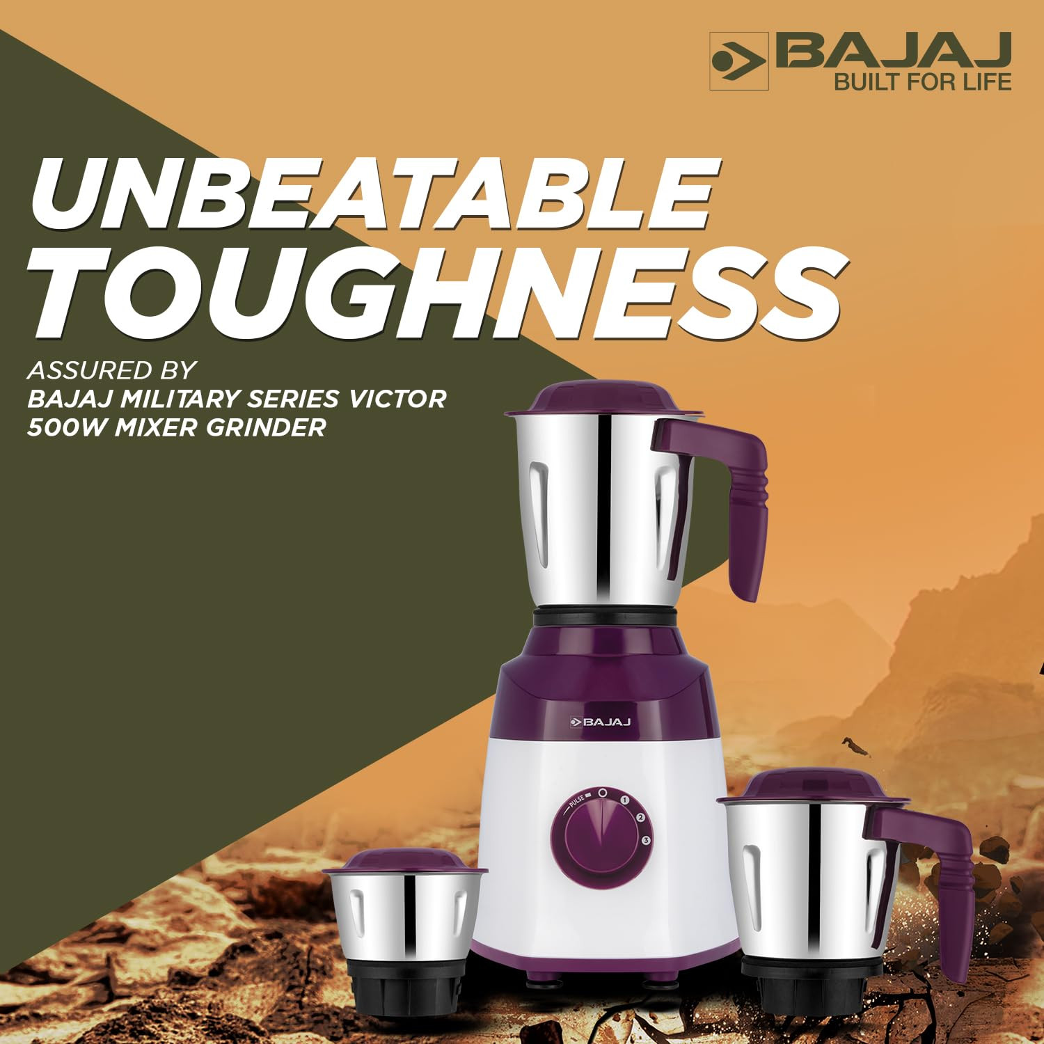 Bajaj Military Series Victor 500 Watts Mixer Grinder | 3 Jars | DuraCut Blades | 3-Speed Control With Pulse Effect Mixie | 2 Yrs Warranty 【White And Purple】