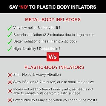 • [SAY NO TO PLASTIC INFLATORS] – Most plastic body air compressors are fragile, noisy and not able to radiate out the heat generated during compression. This results in increased wear and tear of the inner parts. Metal air compressors are stronger, sturdier, can radiate heat better and have much lower noise and vibration.