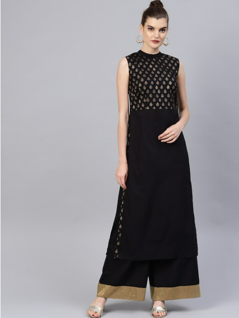 Women Black & Golden Block Print Yoke Design Kurta with Palazzos -