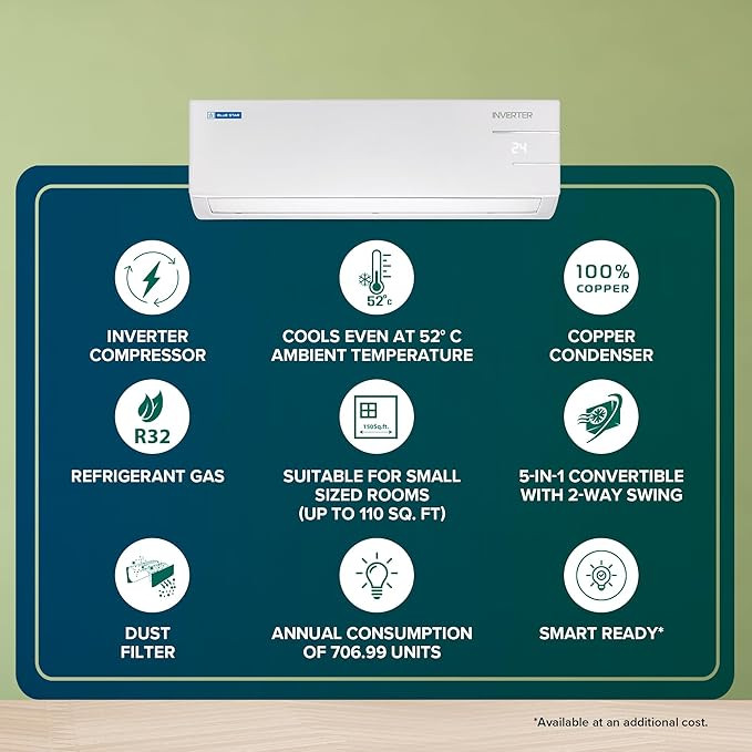 Blue Star 1.0 Ton 3 Star Inverter Split AC (Copper, Convertible 5 in 1 Cooling, Multi Sensors, Smart Ready, Self Diagnosis, 2024 Model, IE312YNU, White)