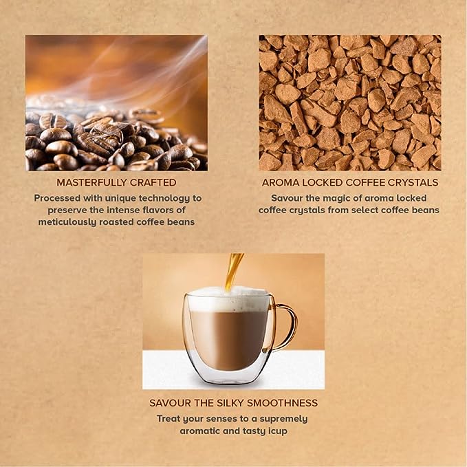 • FINE BLEND OF THE BEST BEANS: Every sip you take from the instant coffee is made from the best coffee from South India, providing premium coffee-drinking experience. The combination creates a smooth brew with an aromatic flavour to enrich your mornings in the right mood.