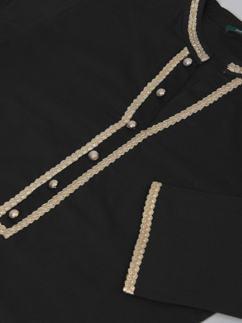 This charming set in a pleasing shade of black is the one for every woman. elaborate embroidery work on the front and on the edge of the sleeves. The round neck on the kurta is lined with subtle embroidery for added detail. The Pants have a straight-cut for a contemporary look and also provides you great comfort with a pocket