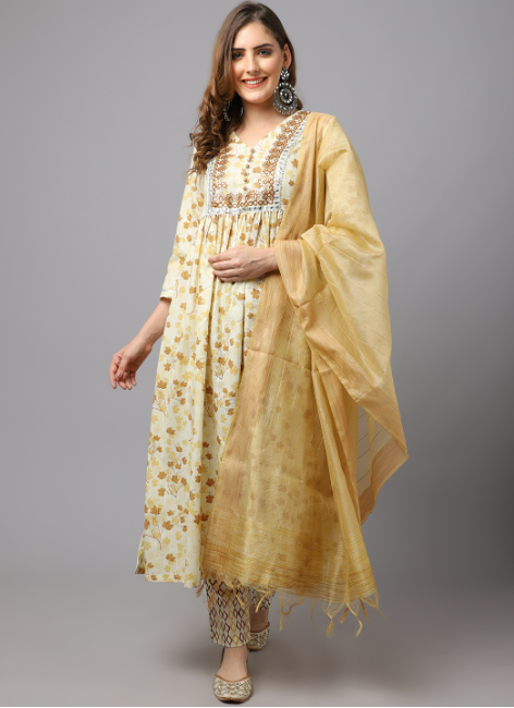 This three-piece outfit is comfortable and easy to style with almost any occasion in mind. The round neckline kurta is complemented by a pair of pants and a silk dupatta, which are stylish and comfortable. The pants feature a drawstring all around, elastic at the back, and spacious pockets that can be styled with a contrasting kurta.