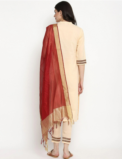 Kurta-Pant-Dupatta set will leave you in awe of its intricately embroidered on the front yoke and the sleeves. the kurta comes with a lovely line of embellishments at the bottom as well to get you festive-ready! The pants with this ensemble promise to provide the perfect fit by providing elasticated at the back to give you the utmost comfort whilst leading the fashion game. The kurta trouser set is layered it with the lightweight yet soft chanderi dupatta given with this set to complete the look.
