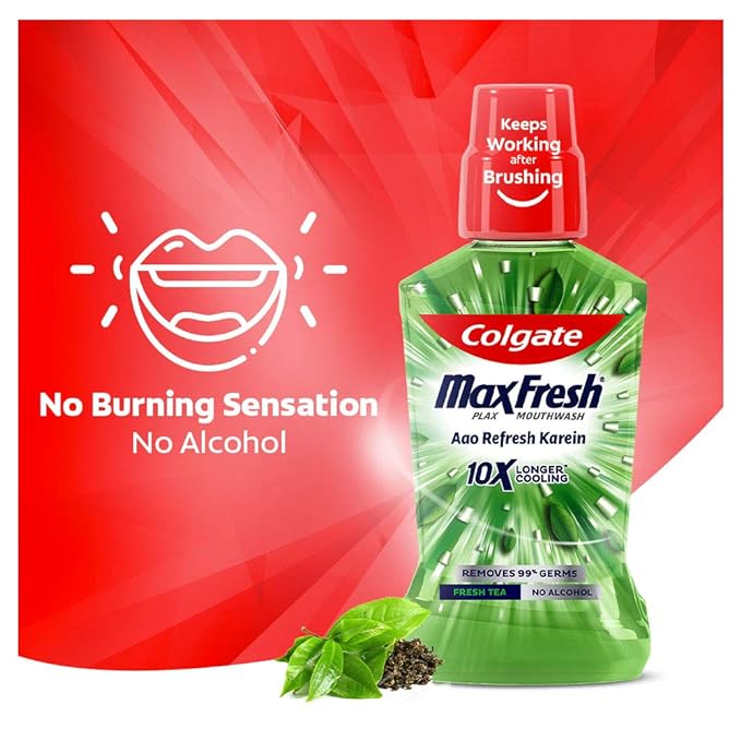 • Colgate MaxFresh Plax Antibacterial Fresh Tea Mouthwash removes over 99% of germs that cause bad breath and cavities, giving you a fresher and cleaner mouth than brushing alone. It has natural tea extracts that provide you with a refreshingly pleasant aroma.