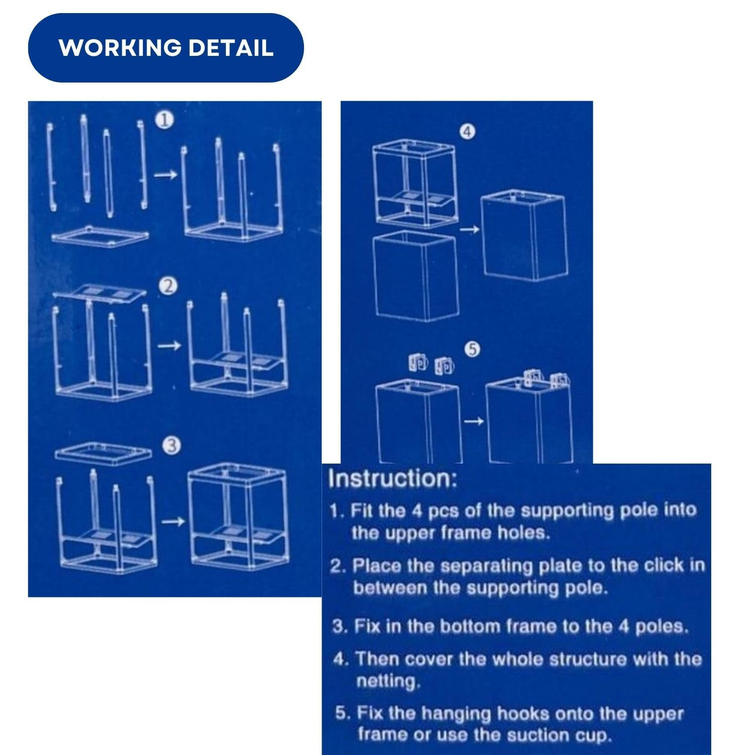 • Instructions: 1) Fit the 4 pcs of the supporting pole into the upper frame holes. 2) Place the separating plate to the click in between the supporting pole. 3) Fix in th bottom frame to the 4 poles. 4) Then cover the whole structure with the notting. 5) Fix the hanging hooks onto the upper frame or use the suction cup.