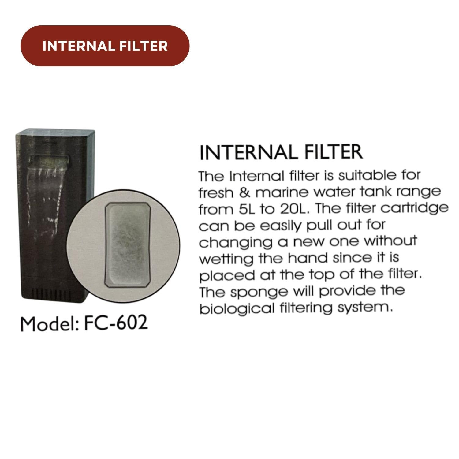 INTERNAL FILTER: Suitable for fresh and marine water tank range from 5L to 20L. The filter cartridge can be easily pull out for changing a new one without wettting the hands since it is placed at the top of the filter. The sponge will provide the biological filtering system.