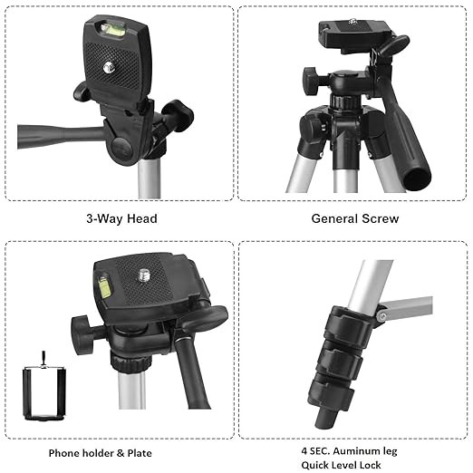 Material: Aluminium Alloy,Three-Way Head:The tripod's three-way head allows for ultimate versatility. Easily change the orientation of the camera from portrait to landscape--and almost any angle in between with the handy tilt motion. Turn the knobs to secure. The tripod also allows for full panoramic possibilities with its 360-degree swivel function.