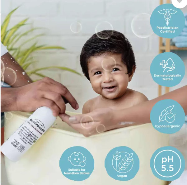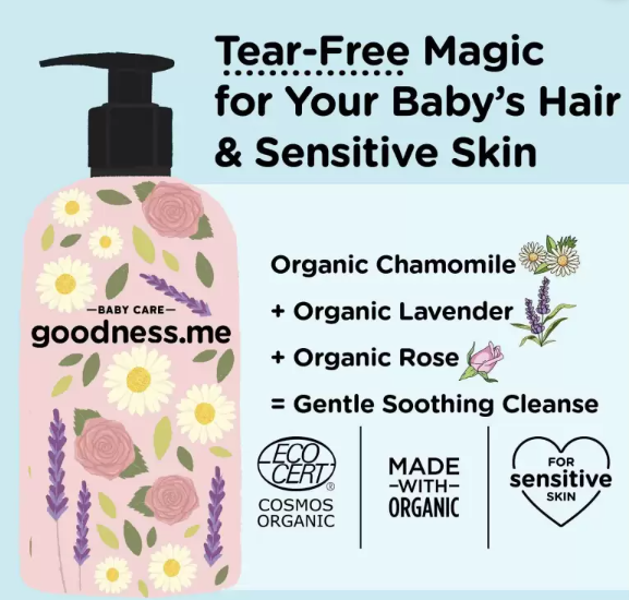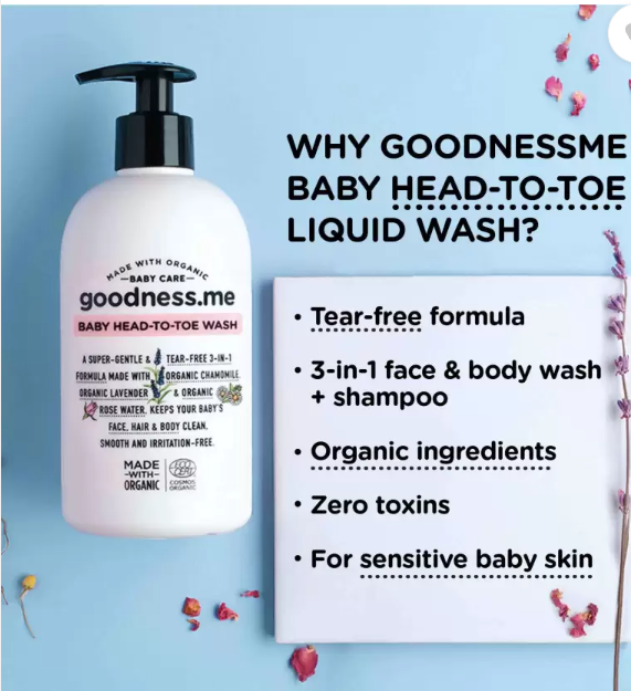 GOODNESS.ME Baby Head-to-Toe Wash, the ultimate gentle cleansing solution designed specifically for your little one's delicate skin. Formulated with natural ingredients, this all-in-one wash provides a soothing experience while effectively cleaning your baby's hair and body. Enriched with nourishing botanical extracts, it leaves your baby's skin feeling soft, hydrated, and refreshingly clean without any harsh chemicals. Make bath time a delightful ritual for both you and your baby with this lovingly crafted product that promises to care for your child’s needs.