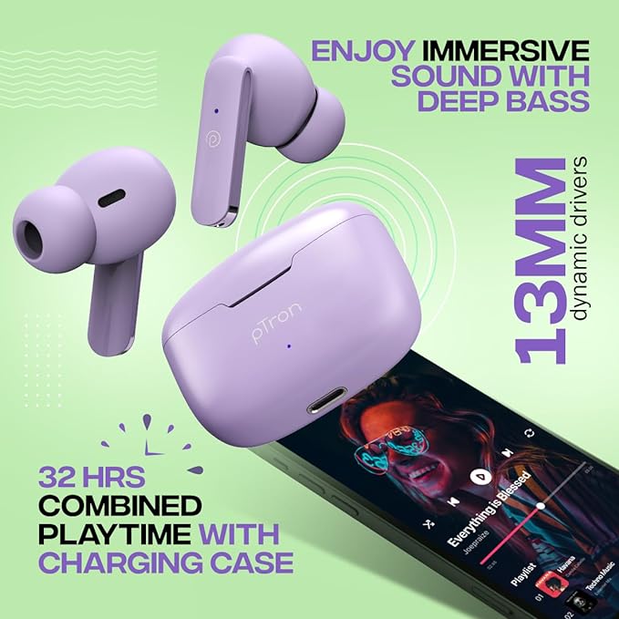 pTron Bassbuds Duo in-Ear Wireless Earbuds,TWS earbuds with Large 13mm Dynamic Driver to produce Immersive Stereo Sound & Deep Bass | Smart Touch controls & 32 Hours of non-stop Combined Playtime with the charging case