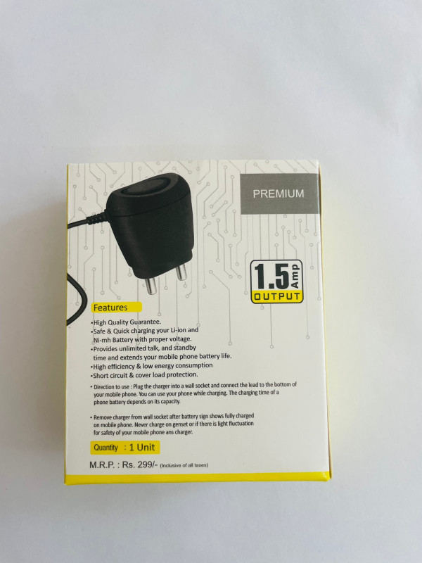This Charger is specially designed for Travelling purpose as the USB is attached to the adapter itself, no hustle of finding the detached USB with this Charger. Auto Detects the connected device and charges it at the fastest speed of the device Compact and Convenient Wall Charger with 1M Micro USB Cable Auto Detect Smart IC with preventing overcharging Over Temperature Protection, Input Over-Voltage Protection, Output Over-Current Protection Input: AC 100-240V (50-60Hz) | Output: 5V-1.5A. India's smallest charger with 1.5 amp power supply.