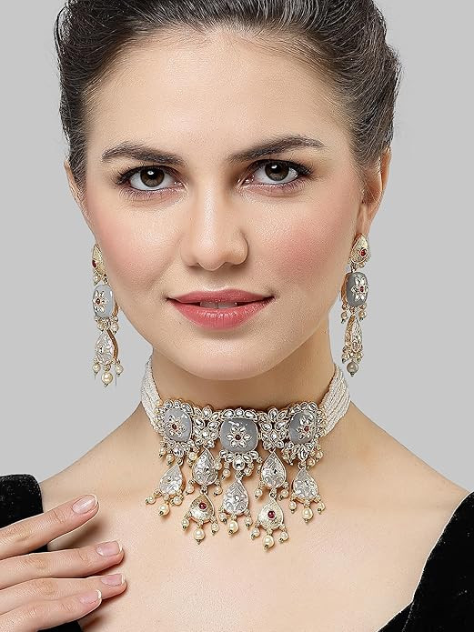Karatcart Gold Plated Grey Meena Kundan Choker Necklace Set for Women. Our products are designed with high-quality material and these products are enhanced with plating that are skin-friendly & with love to reach your heart.