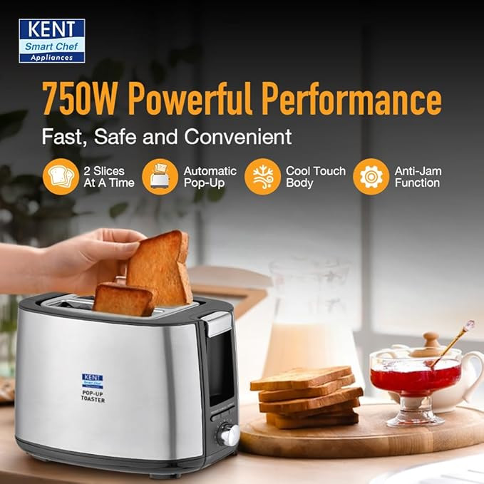 Kent 16105 Crisp Pop Up Toaster 750 Watts | 2 Slice Automatic Pop Up Electric Toaster | 6 Heating Modes | Auto Shut Off | Removable Bread Crumbs Tray | White