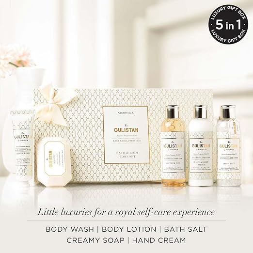 REASONS TO LOVE: Majestic fragrance of Rose Absolute and Iris | Luxurious, all-encompassing royal bath essentials | Infused with Organic Rose Water, Ginkgo Biloba & White Tea Extracts | An elegant gift ideal for all occasions Thoughtfully curated for all skin types | 100% vegan