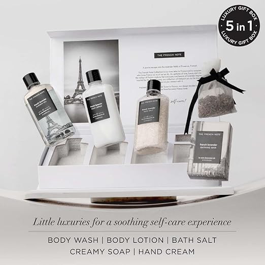 THIS 5 In 1 GIFT SET CONTAINS- 1 Shower Gel - 100ml, 1 Body Lotion - 100ml, 1 Bath Salt 100g, 1 Handcrafted Bathing Bar 100g,1 French Lavender Potli With Buds
