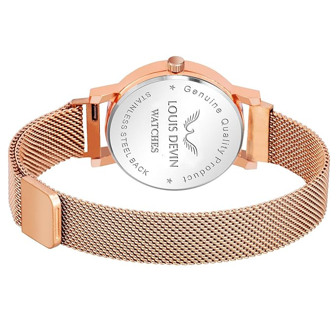 LOUIS DEVIN Rose Gold Plated Mesh Chain Analog Wrist Watch for Women (Black/Blue/Rose Gold Dial) | RG162