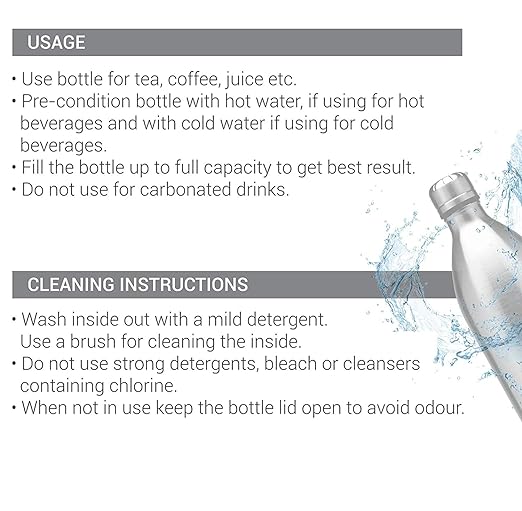 • Fill the bottle completely to maintain the temperature and not use for carbonated drinks. Pre-condition bottle with hot water if using for HOT beverage and cold water if using for COLD. No matter where you go, you will never have to worry about carrying your water in a safe and secure manner again.