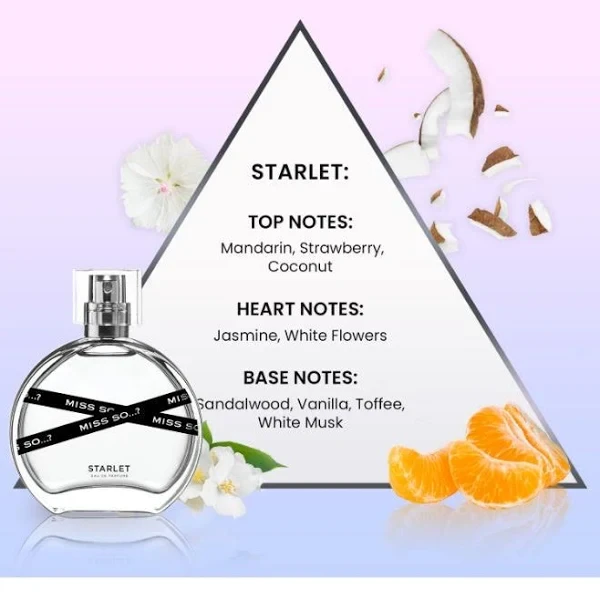 Introducing the enchanting MISS SO...? STARLET EDP, a captivating fragrance designed for the modern woman who embodies glamour and elegance. This exquisite perfume opens with a burst of vibrant notes, leading you on a journey through a heart of floral and fruity allure, before settling into a warm, creamy base that leaves an unforgettable trail. Ideal for both day and night wear, STARLET EDP becomes your signature scent, enhancing your presence and leaving a lasting impression wherever you go.