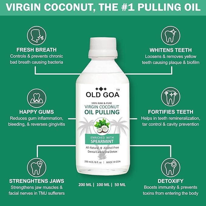 OIL PULLING FOR ORAL CARE: OldGoa Oil pulling Formula is based on 3000 years research with virgin coconut Oil for mouth & teeth & is infused with pure essential oils. It?s a traditional Ayurvedic technique. Swishing coconut oil around your mouth to kill bacteria & improves dental hygiene. There are 2 different processes. KAVALA involves putting less oil in the mouth, swish it for 2-3 mins, & then spitting it out. GANDUSHA involves putting a lot of oil in the mouth & holding it for 10-15 mins.
