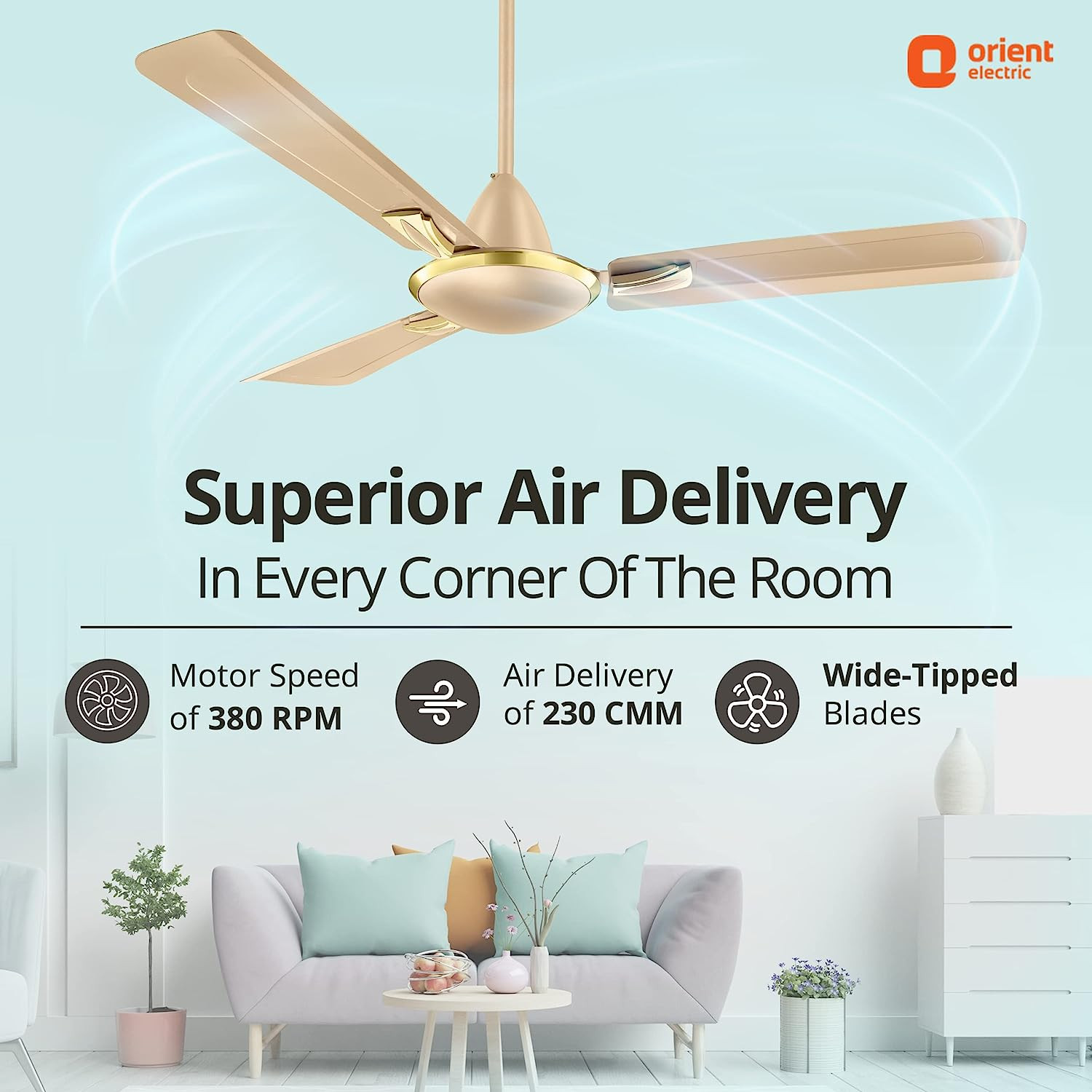 WIDE RIBBED BLADES: Operating at high speed of 320 RPM with air delivery of 230 CMM, keeps every corner of the room breezy.