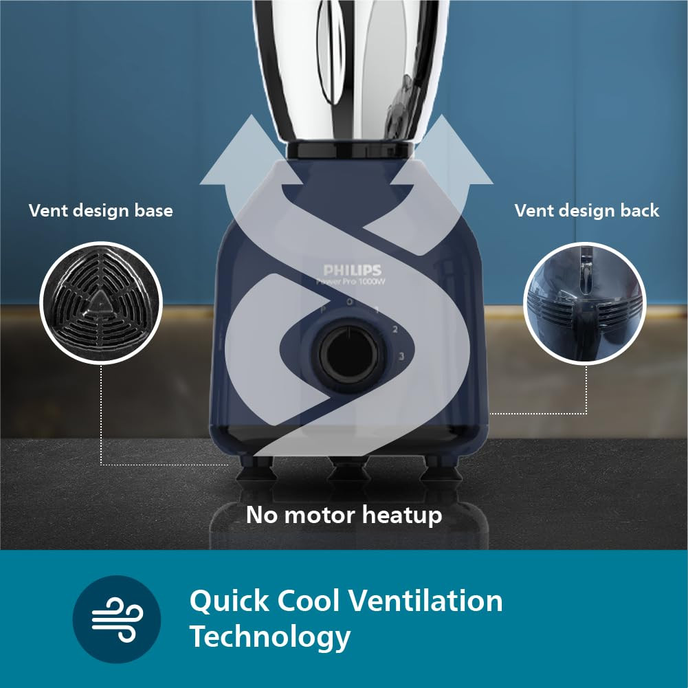 Philips HL7713/01,1000 W PowerPro Motor Mixer Grinder, 3 Jars (Azure Blue), Edged blade made of superior SS304 material, Quick cool ventilation for longer motor life