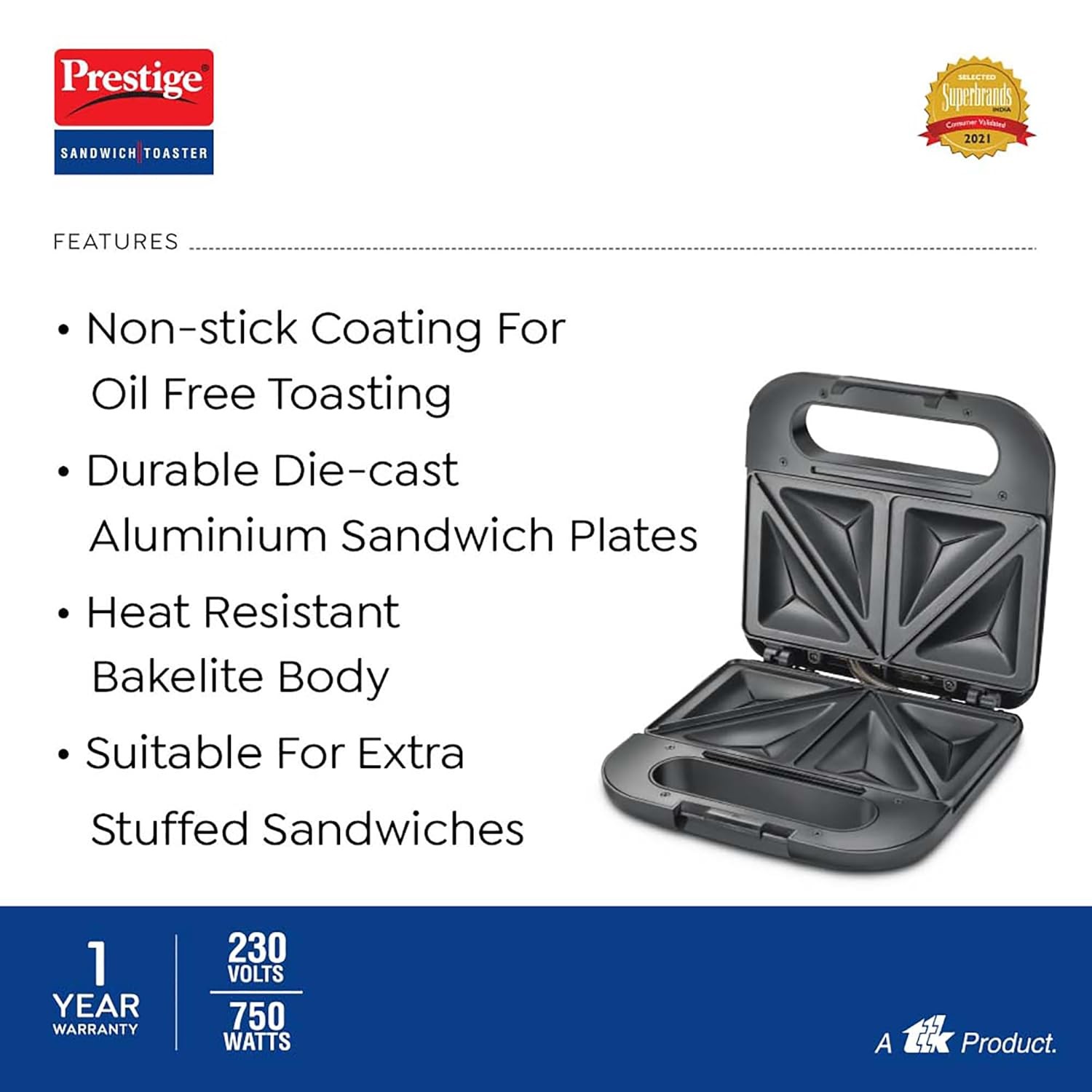 • Durable Die-Cast Aluminium Sandwich Plates- Robustly built, these provide sturdiness to the sandwich maker ensuring delicious sandwiches for years to come, Non-stick coating for oil-free toasting