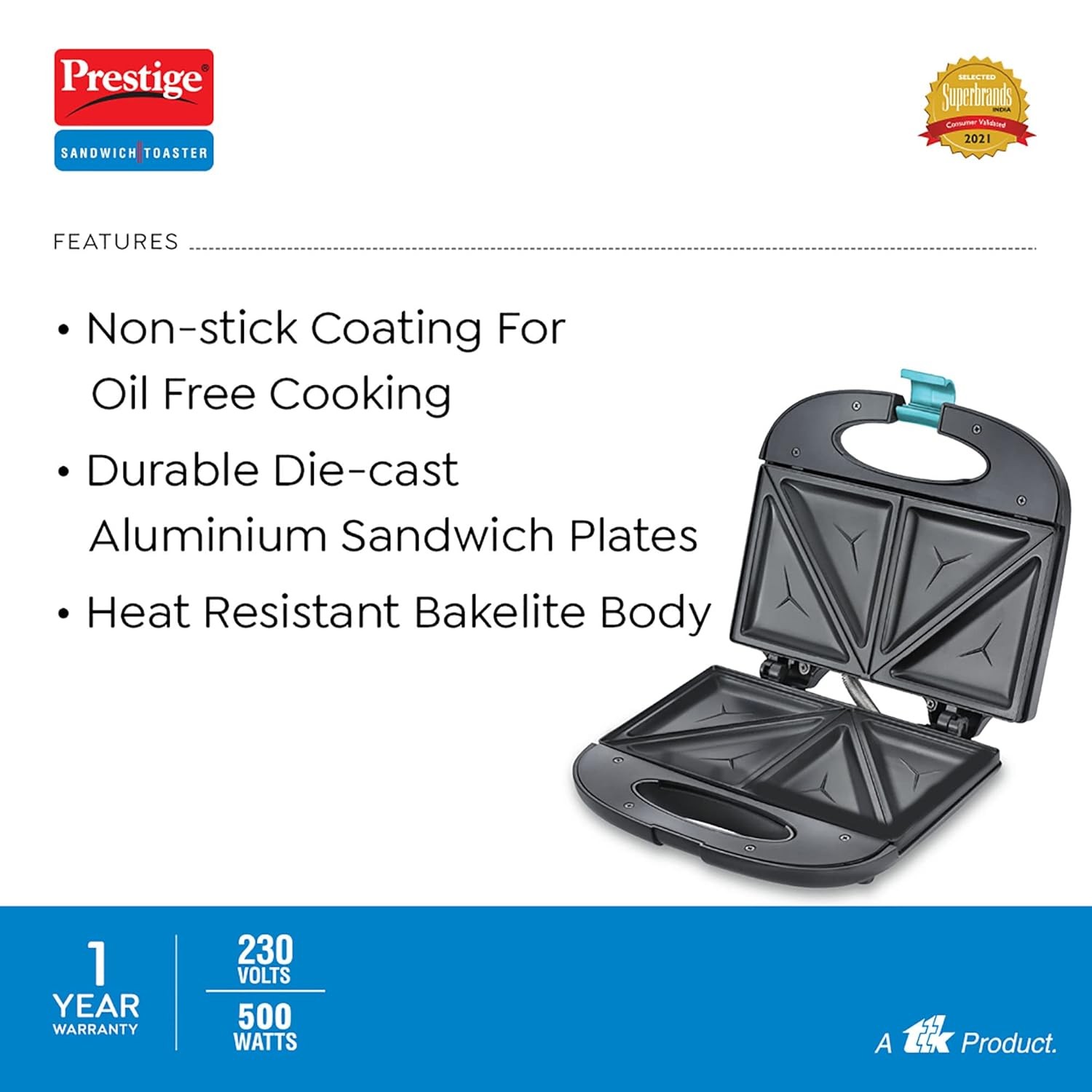 Prestige PSMFB (D) 800W Sandwich Toaster with die cast Aluminium Sandwich Plates|Power Indicators|Non-Stick Coating|Black|1 Year Warranty