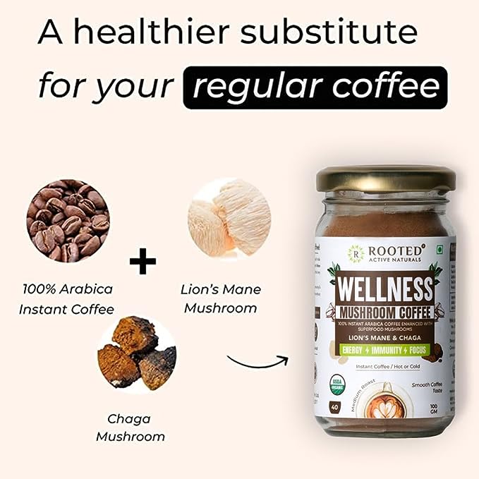 ROOTED Actives Wellness Muhroom Coffee (100 G), IC(Lion's Mane & Chaga - 20%) |Focus, Energy, Immunity & Heart Health, Powder, Jar Visit the ROOTED Store