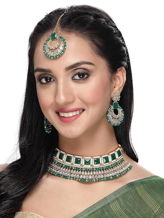 • Green Kundan and Beads: The choker necklace, earrings, and maangtika are adorned with exquisite green Kundan stones and beads, creating a striking and captivating look.