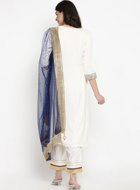 White & Navy Blue Printed Kurta with Trousers & Dupatta -