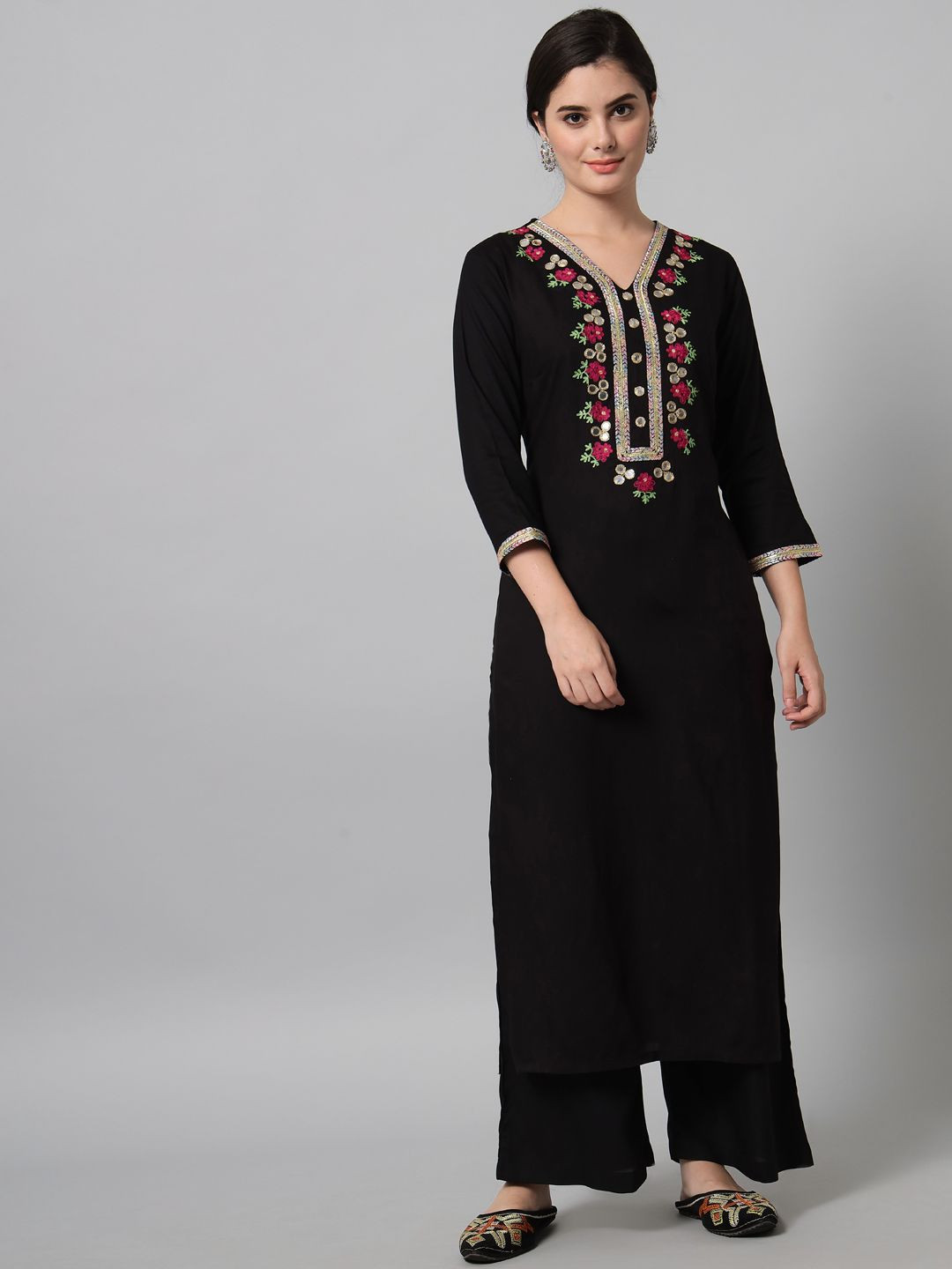 The stunning kurta is embellished beautifully with mirrors and hand embroidery around the neck in a geometrical layout. The V-neckline and the two pockets deserve a special mention. This design is easy to style as workwear or to be worn at social gatherings. Coupled with a pair of palazzos, this long kurta for every mood is just splendid! Accessorize accordingly but don’t forget, your smile is the best feature!