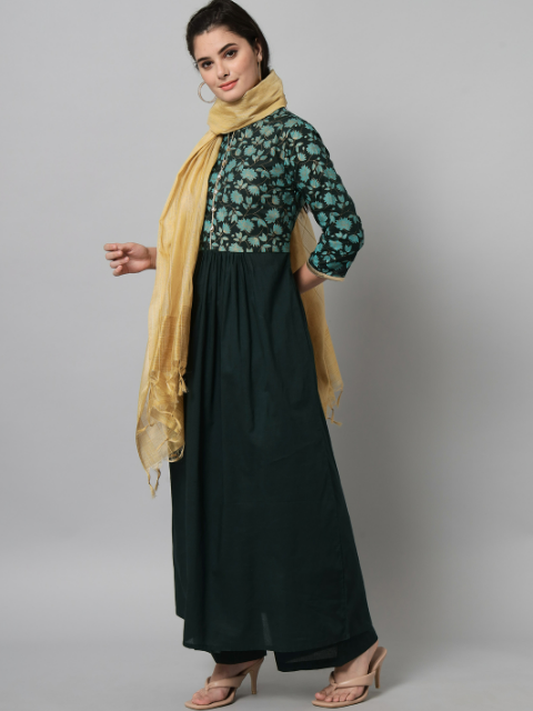 Bottle green hand block printed kurta palazzo set with dupatta -