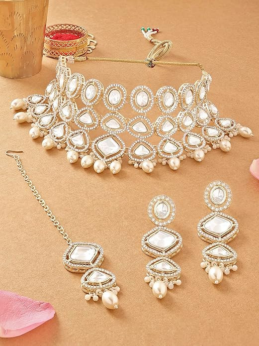 Features :Kundan jewellery has long been a staple of Indian wedding jewellery. It is a classic type of jewellery that is made with considerable expertise and attention to detail.Austrian Diamonds & Beads jewellery has a gorgeous appearance that provides a sumptuous and elegant touch to a bride-to-be's attire. The necklace set is typically composed of a choker, a pair of earrings. This set is a symbol of luxury and elegance and is the perfect accessory for the bride’s special day.