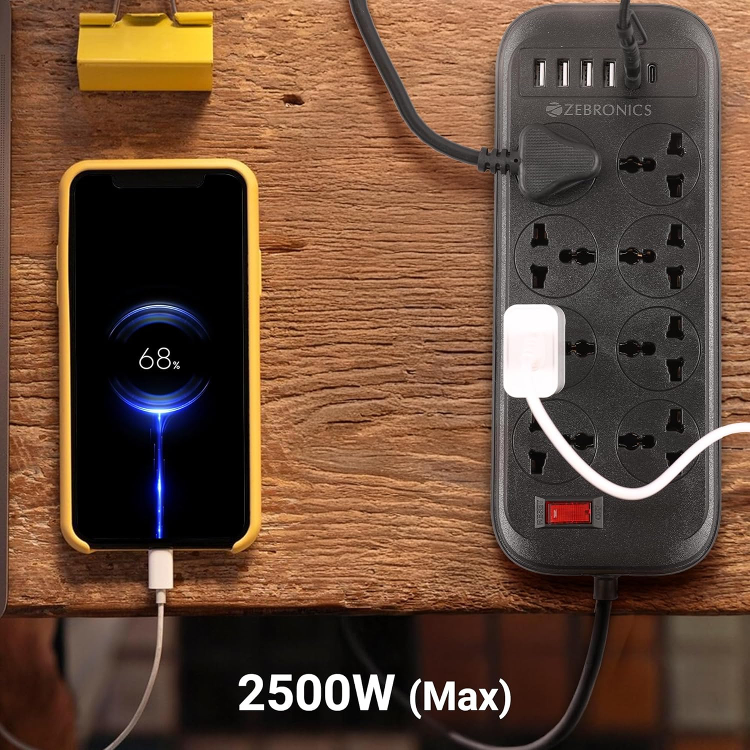 ZEBRONICS POWER BAR 282, Power Strip, 2500 Watts, 10 Amps, 1x Type C Port (15.5W), 8x Universal Socket, 4+1 USB Port (15.5W), LED Indicator, On/Off Switch, Overload Protection, Wall Mountable, 2 Meter