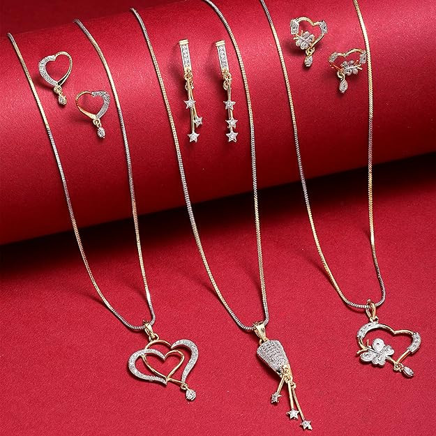 ZENEME Jewellery Set Gold Plated American Diamond Heart Shape and Crystal Style Pendant Necklace Set for Women and Girls Set Of 3