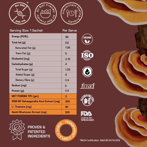 80mg L-THEANINE (PURE TEA EXTRACT): Experience serene sleep with our powerful combination of L-Theanine & Reishi. Calm your mind and enable restful and rejuvenating sleep to wake up refreshed and energized. Regulate sleep patterns with Reishi and reduce sleep latency with L-Theanine. Say goodbye to restless nights and groggy mornings. Unlock the power of this natural wonder combination for the ultimate chill experience.