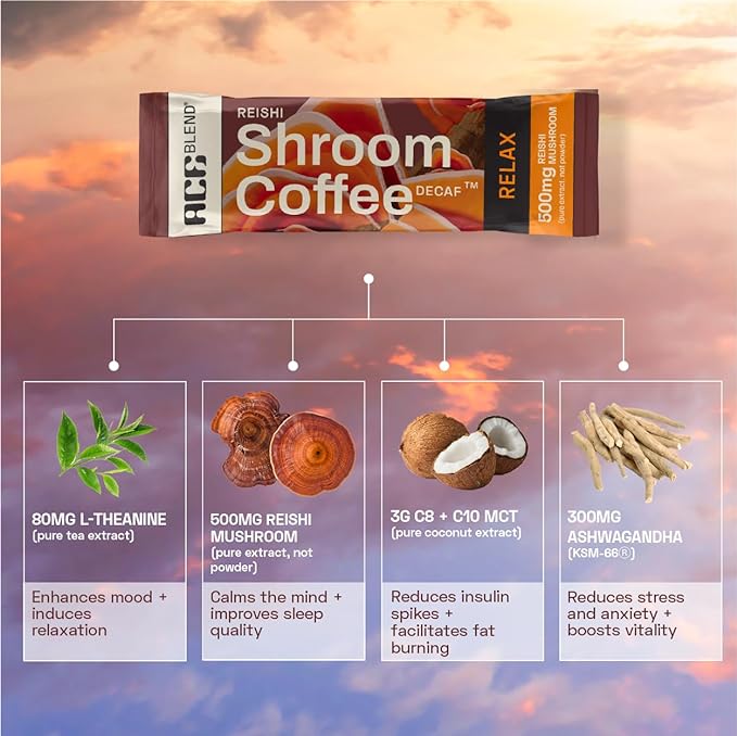 500MG REISHI EXTRACT (PURE EXTRACT, NOT POWDER): Discover the serene power of Reishi with Ace Blend. Our fully organic extract, sourced from log-grown fruiting bodies, offers pure and unadulterated tranquility. Say goodbye to stress and anxiety as you prioritize your mental well-being. Experience the perfect evening decaf or nighttime coffee for unwinding, improving sleep quality, and relieving deep-seated stress. Reishi is nature's soothing and natural solution.