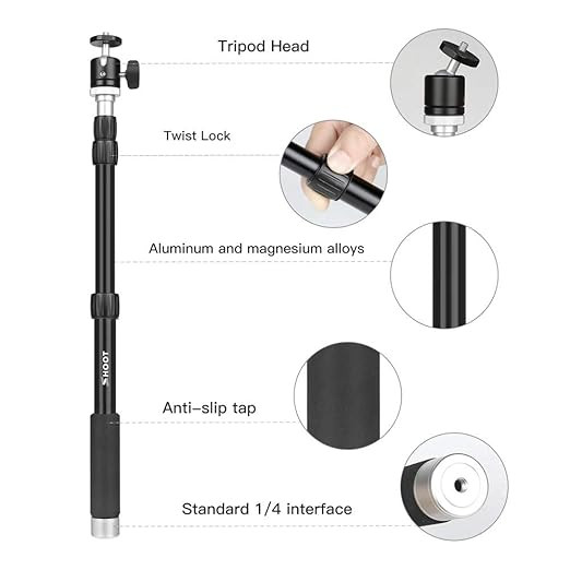 Unique ball-head for easy adjustment to any angle. alloy metal and plastic material, the selfie stick has a non-slip handle. You can use the thumb screw of your action sport camera to keep your device secure.The anti-slip groove design can avoid rotating while taking photos.