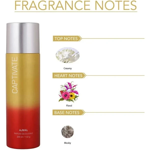 Unleash your captivating charm with AJMAL – Captivate Deodorant, a fragrance designed for those who dare to make an impression. This sophisticated deodorant merges enticing notes of woody and floral elements, leaving you feeling confident and refreshed all day long. The long-lasting formula ensures that you stay protected against odor, while the stylish packaging makes it a perfect addition to any grooming kit. Whether you're heading to a business meeting or a night out with friends, let your presence speak volumes with the alluring scent of Captivate.