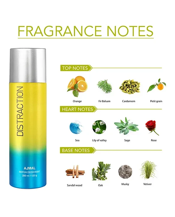 Introducing the AJMAL Distraction Deodorant – the ultimate fragrance to elevate your confidence and leave a lasting impression. This exceptional deodorant combines captivating notes that perfectly blend vibrant citrus with warm undertones, ensuring you stay fresh and invigorated all day long. With its long-lasting formula, the AJMAL Distraction Deodorant offers powerful protection against odor while enveloping you in a mesmerizing scent. Whether you're headed to the office, a weekend outing, or a special event, this deodorant is your go-to companion for any occasion.