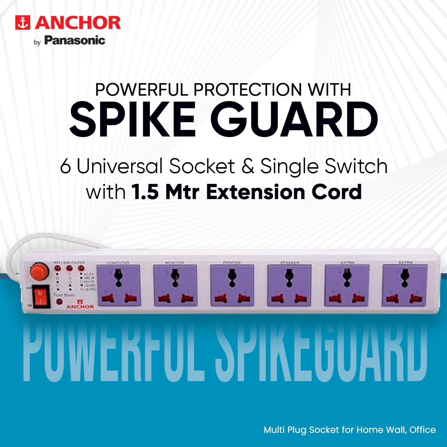 Anchor by Panasonic 6 way Universal Socket with Single Switch | 6 Way Extension Board with 1.5 Mtr Extension Cord | Multi Plug Socket for Home Wall, Office (22579)
