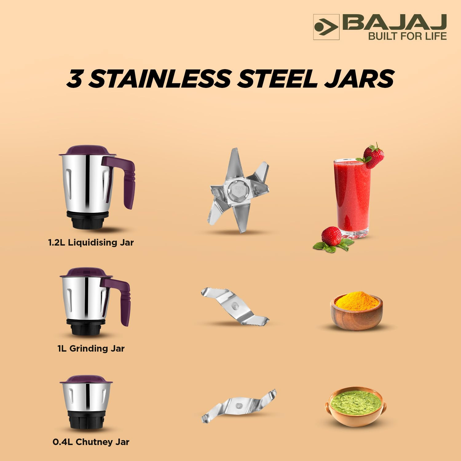 Bajaj Military Series Victor 500 Watts Mixer Grinder | 3 Jars | DuraCut Blades | 3-Speed Control With Pulse Effect Mixie | 2 Yrs Warranty 【White And Purple】