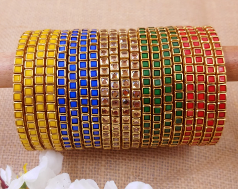A bangle is a rigid, loose-fitting bracelet that you can wear on your wrist alone or in combination with other bangles. The poetic symbolizations of Indian literature glorify bangles and brand them as the pinnacle of feminine elegance. Traditionally breaking of the bridal glass or lac bangles is considered inauspicious. Bangles are round, stiff and designed to hang loosely around the wrist.
