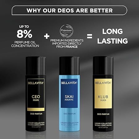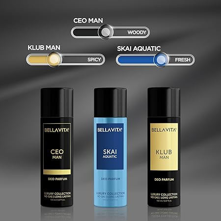 Bella Vita Luxury Unisex Body Parfum Deo Spray Gift Set,Pack Of 3 X 150 Ml, No Gas Long Lasting Premium Fragrance Deodorant|Ceo Men|Skai Aquatic|Klub Men|With Tonka, Bergamot & Vanilla