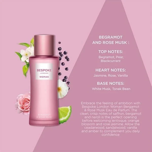 Indulge in the luxurious essence of femininity with the BESPOKE London Woman Bergamot & Rose Musk Eau de Parfum. This intoxicating fragrance beautifully balances the bright, refreshing notes of bergamot with the soft, romantic allure of rose and the warm depth of musk. Perfect for any occasion, this exquisite scent weaves a tapestry of elegance and sophistication that empowers women to express their individuality with confidence. Let your senses be enveloped in this captivating blend that inspires passion and grace throughout the day.
