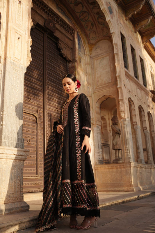 BLACK VELVET EMBROIDERED KURTA PANT DUPATTA SET Fabric-